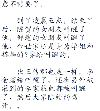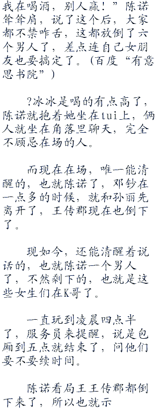 “少爷行啊,一个人灌倒了六个人?”?冰冰和自己的朋友在聊天,今天在场的还有贾净雯,她是孙丽叫过来的朋友