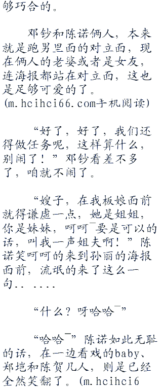 “没有,我和郑垲过来这里,就看见了娘娘海报和范爷的海报面对面的摆放着,看,她们都为自己代言的服装给相互瞪眼了!”陈贺解释的时候,邓钞和陈诺还真的就看了一下。