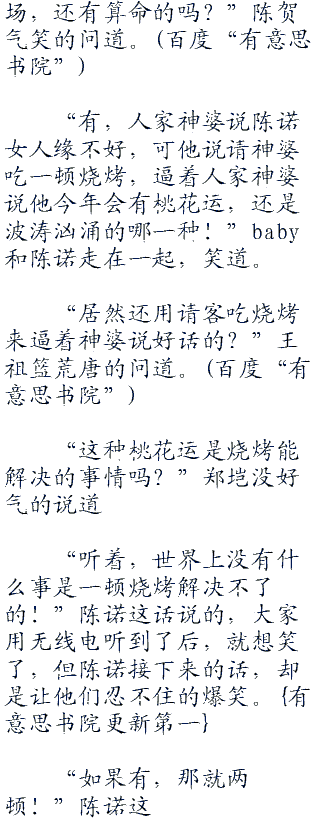 “他在算命呢!”baby的笑声传达到了每个人的对讲机上面,而只有郑垲一个人无聊在监狱里面,看着无线电听听声音。