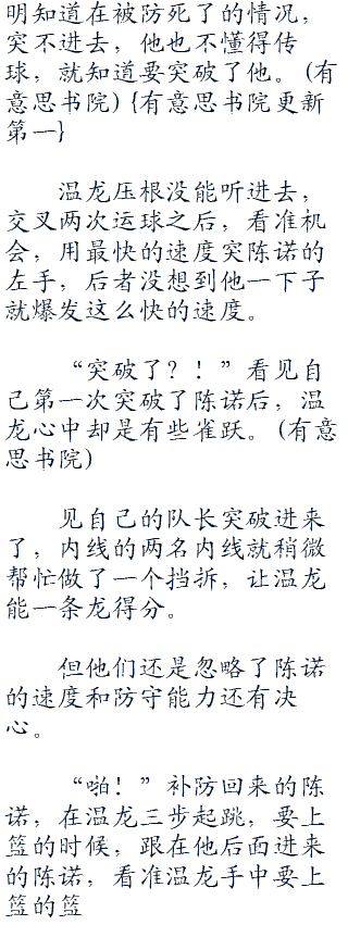 下半场开始,陈诺一如既往,频频突破温龙,吸引防守了后,立马就找到最好的位置传球出去,也不单打独斗,只有偶尔一次,在防守他的队友很严的时候,他才会自己单干。
