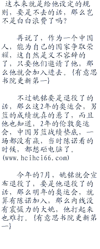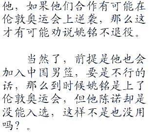 “我觉得亏了,要是陈诺加入男篮,明年一起去伦敦奥运会的话,那么和姚铭配合的话,我觉得我们男篮的成绩,可以更好!”