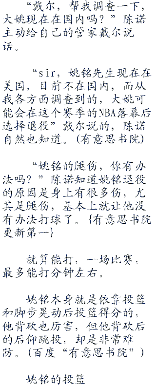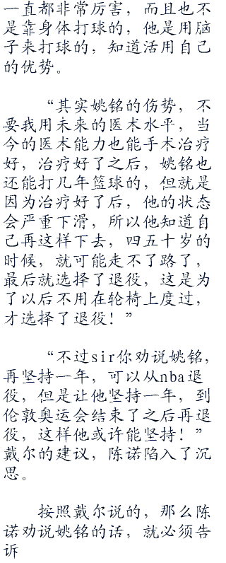 “再说了,姚铭现在腿伤还能好起来吗,或许当年广dong的某个篮球队,不潜规则陈诺的话,那么他在年的时候,或许进入男篮还有点表现,但现在看来,陈诺的篮球实力是强悍了,但姚铭也不可能还打球了,据说都要退役了!”