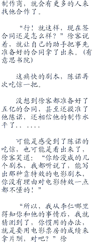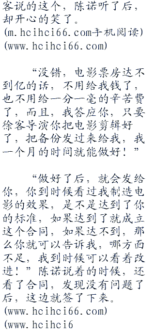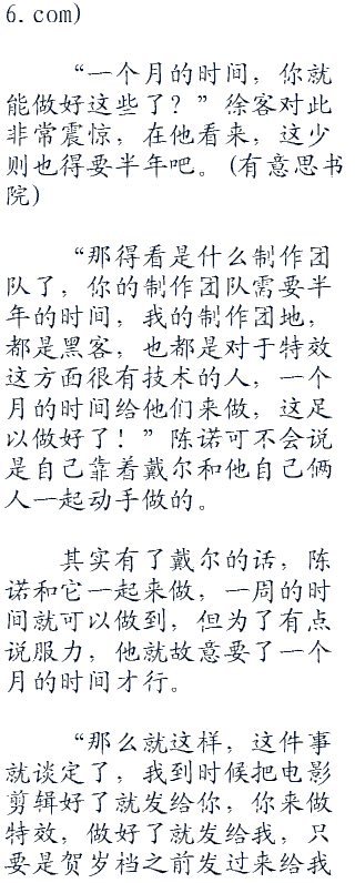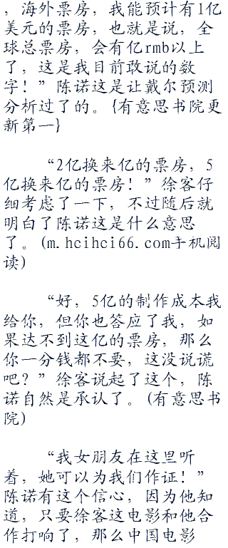 “如果没有把握,我也不敢跟你要这制片成本了是不是?再说,如果徐导你不找我做,那么我先答应了《鸿门宴》,帮他们做出来,那么到时候,他们成为了中国首部大成功3d电影的话!”