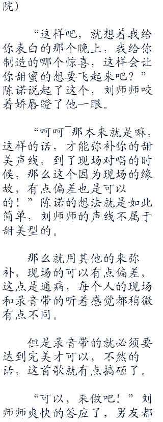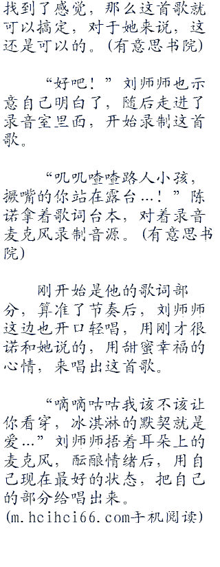 “好啦,快点吧,录制歌曲,录制了之后,我们出去约会!”刘师师觉得不说了,和男友先录制了歌曲再说吧。