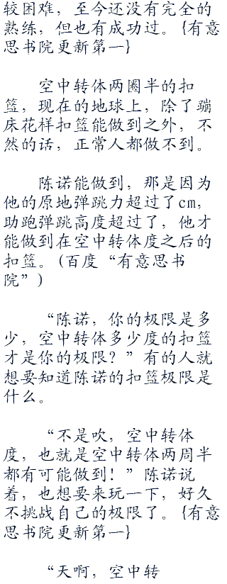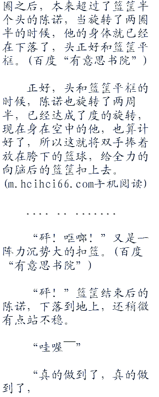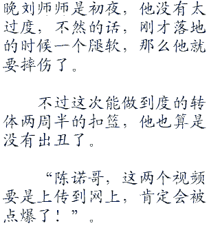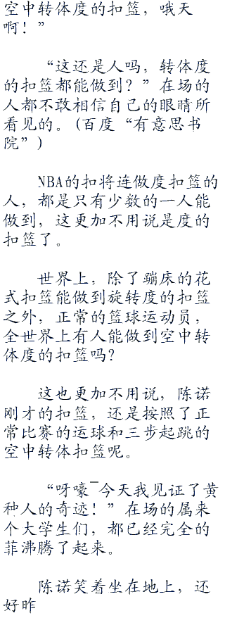 “噢”当看见陈诺真的完成了空中转体度的扣篮后,在下面用手机拍摄的大学生们,都纷纷惊呼。
