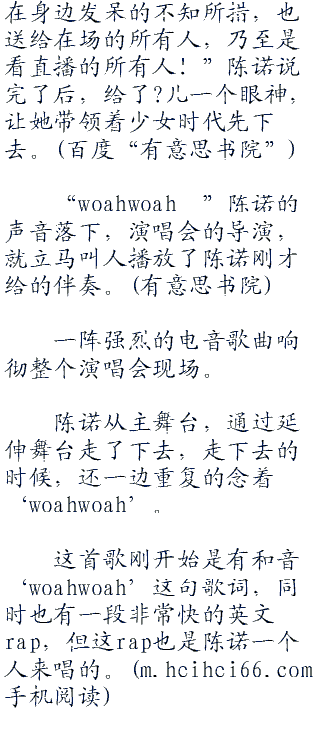 表演结束了后,陈诺这才停下来,然后转身看着舞台下尖叫的歌迷们。