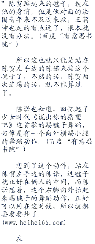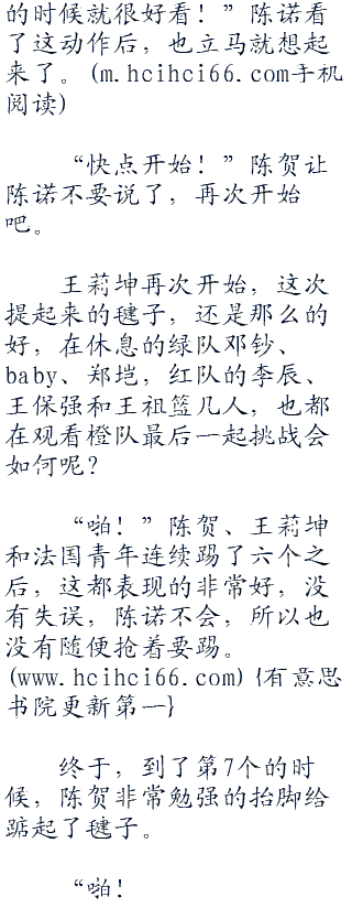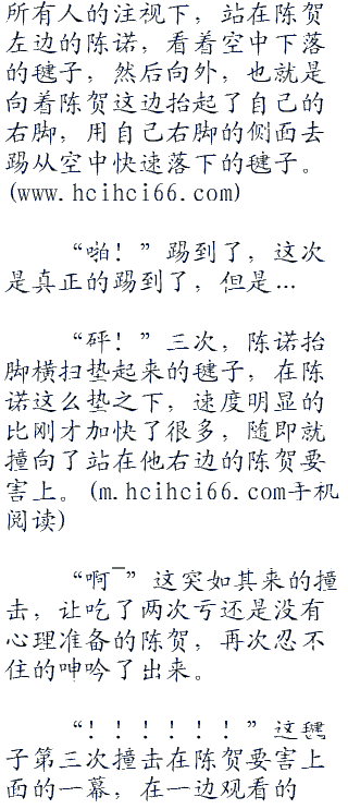 可好死不死的是,这毽子就好像追踪器似得,一个劲的往陈贺的要害撞击,而重要的是,同样的传球者,同样的踢球者,同样的动作,同样的角度,同样的命中了要害。手机阅读更方便m.