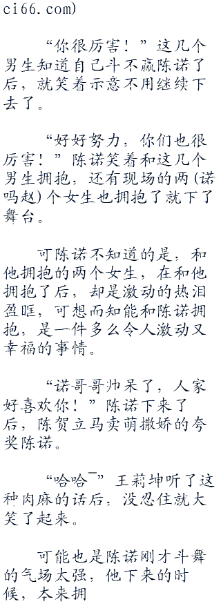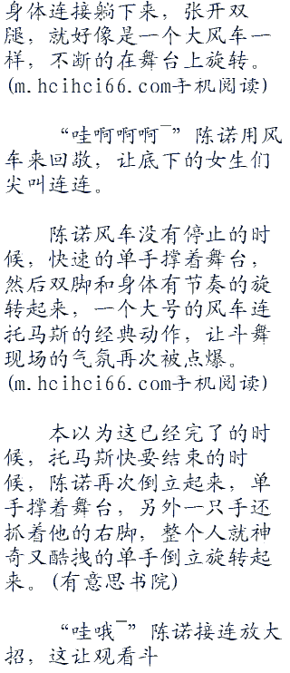陈诺站在舞台上,笑看着他前面跳舞炫丽舞步的男生,最后对方却是来了一个单手倒七来结束自己的挑衅。