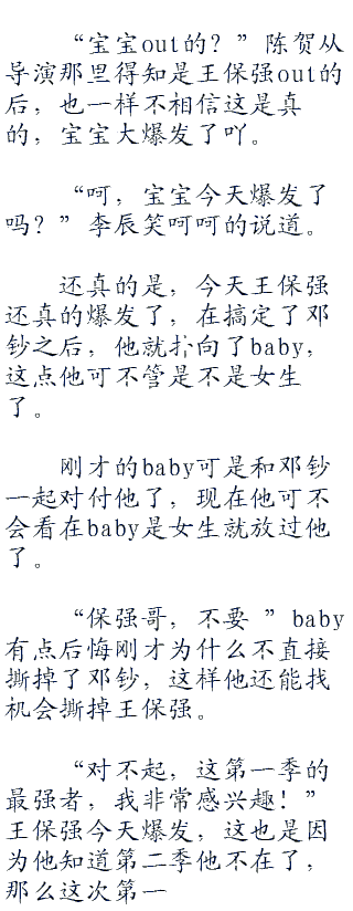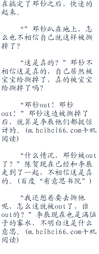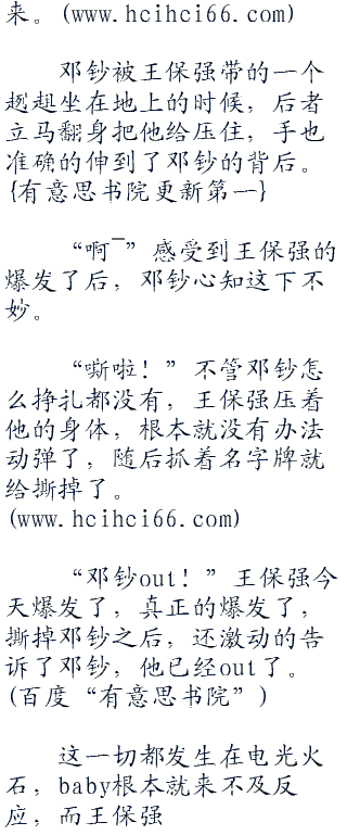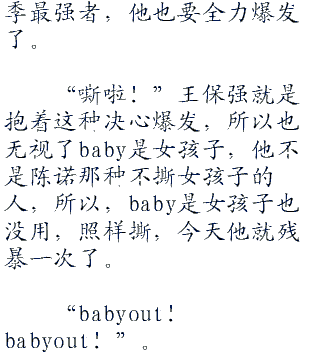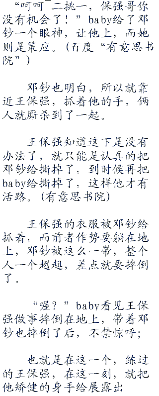 “个人战!”baby一直都在心中打鼓,不知道这是要怎么办才好,要不要撕了邓钞,这是个人战,不是团体战。