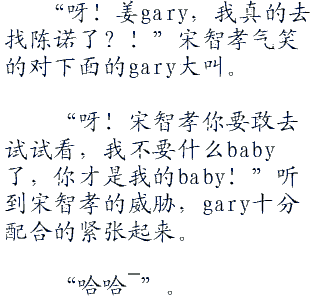 “baby,我是李光洙,是你的头号粉丝!”李光洙也一样兴奋激动的跑出来怪叫,听着这种悠闲的声音,负责拍摄的vj们都忍不住的轻笑了起来。