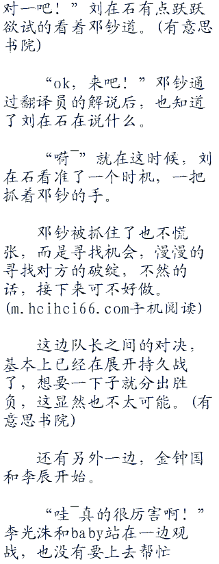 “来吧!”池石镇?n瑟的对前面的陈贺示意了一下,这中韩两国跑男里面的最弱,已经纠缠在一起十分钟了。