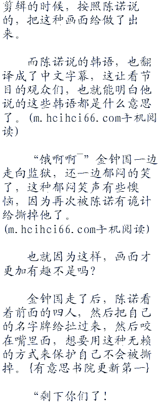 “我真的是…”金钟国现在被out了还没有走,陈诺就干脆催促道:“赶紧走啊,out了的人没资格在这里,去监狱里面呆着去!”