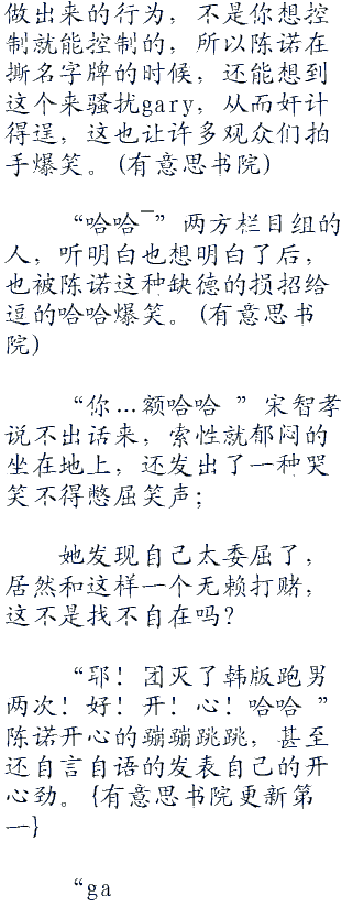 当节目播出的时候,陈诺这无耻的诡计,也把看节目的不少观众都逗的轰然爆笑不停
