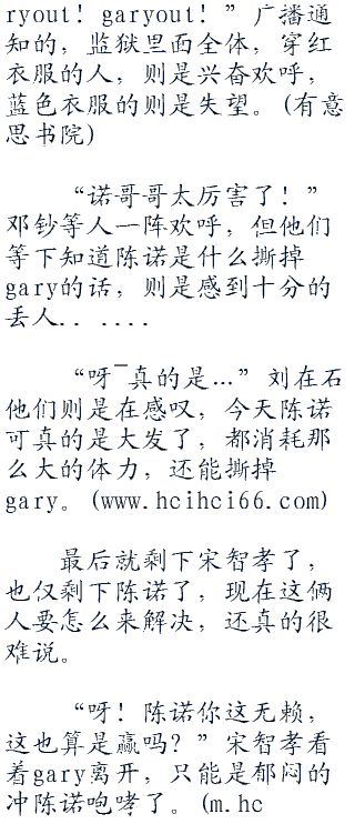 “耶!耶!耶!”陈诺撕掉gary了后,整个人就拿着gary的名字牌欢舞的在一边蹦蹦跳跳,这开心得就跟一个小孩子似得。