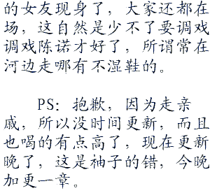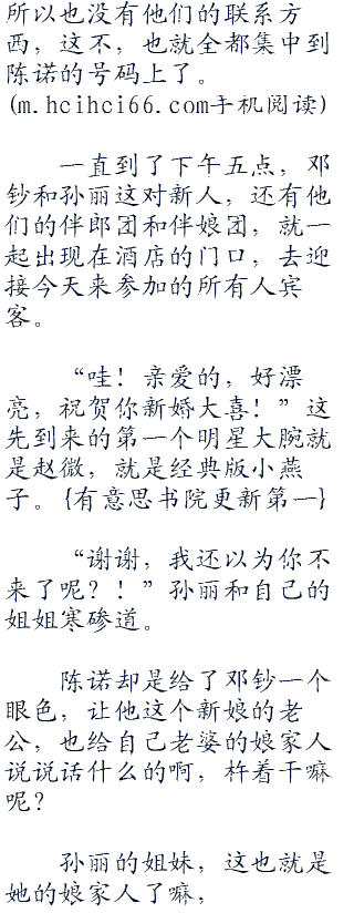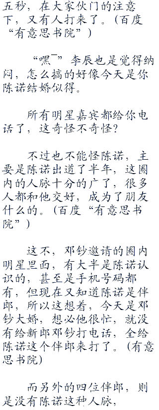 “喂!”陈诺最忙活,因为知道他是伴郎,所以很多宾客有陈诺手机的,都会主动给他电话,问他地址,还有因为什么事情,可能要晚一点等等的事情。