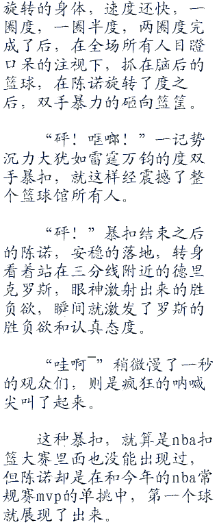 同时起跳的俩人,陈诺在罗斯的身后,头明显的要比后者高一点,大手也快速的如同一个苍蝇拍似得,大力拍击罗斯单手抓住的篮球。