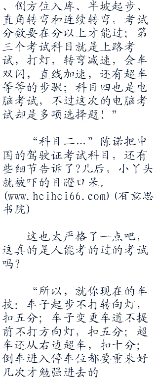 “分为四个考试科目,第一个考试科目就是电脑考试,这个和你们差不多,没有什么好解释的,但是考试分数要在分以上;第二个考试科目包括了:倒车入库