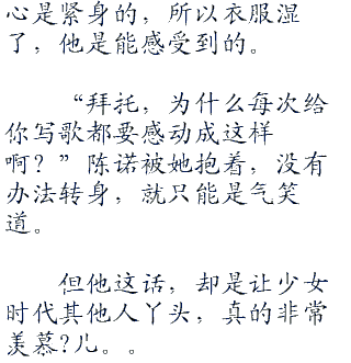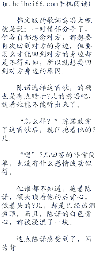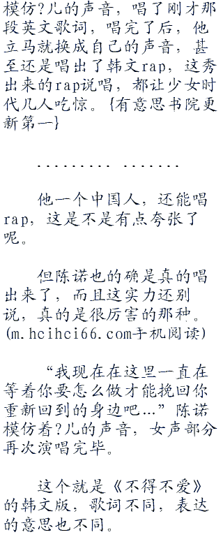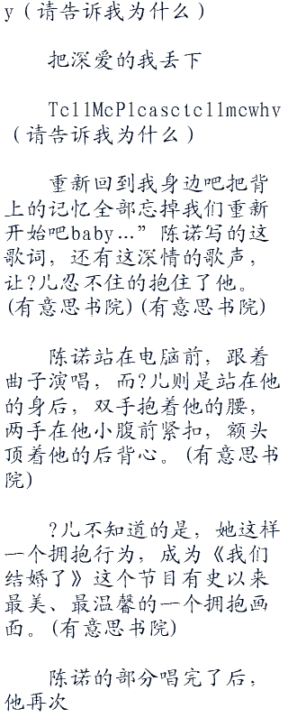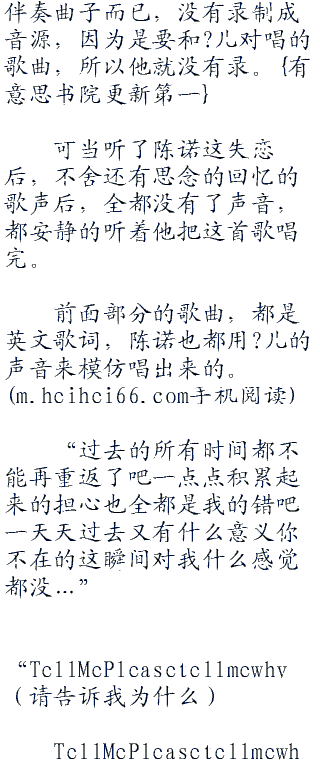 “mybabyiloveyousomuch(我的宝贝我爱你这么多)foreveryouandi(永远的你和我)iloveyouohiloveyousomuch(我爱你哦我爱你这么多)foreveryouandi(永远的你和我)…”陈诺模仿着?儿的声音,把前面部分的歌词给唱出来。