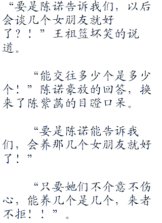 反正陈诺这样不算是犯法,因为他是有权限的人,一个少数民族的艺人,是有权利堂堂正正的交往多个女友的。