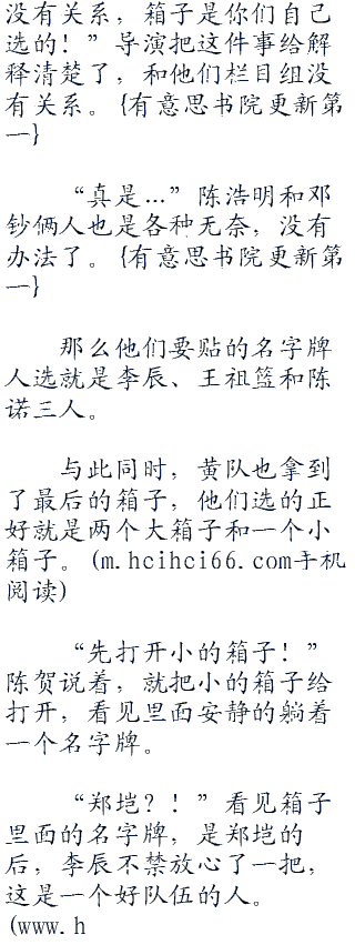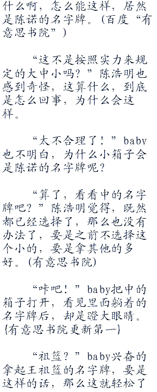 “在哪里?在哪里?!”baby快速的去寻找箱子,陈浩明和邓钞俩人也分开了去寻找,想要看看这次到底是谁先拿到的呢。