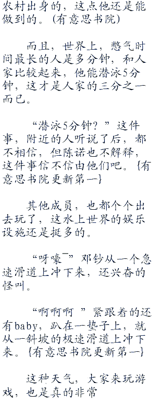 “陈诺哥,你潜泳还能游这么长的距离?”在这个水世界玩的人可不少,同样在海啸区这里,更是不少人都泡在水里面。