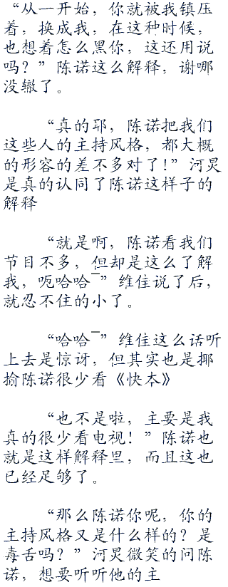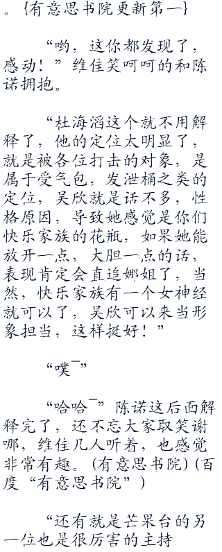 “哈哈~”陈诺这样理解谢哪的主持风格,刚说完,河炅等人就哈哈爆笑。