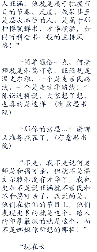 “何老师就是属于说话有分寸有风度,和蔼可亲,但又不失搞笑氛围的老大级主持风格;谢哪就属于是形象破坏性的主持风格,通俗一点就是神经、有病得治的风格…”
