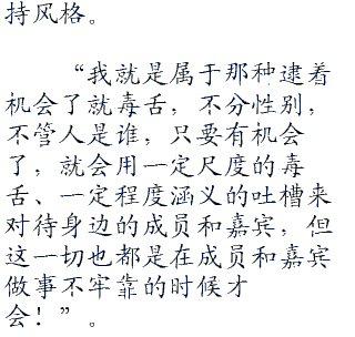 “嗯~这样说吧,每个主持人都有自身的一种风格,就好比如你们快乐家族五个人的主持风格,或者说是主持特点吧!”