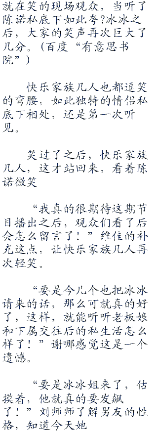 “好了好了,我们不说了,就让师师来说说,平时私底下的陈诺,是一个什么样的人好吧,大家想知道吗?”河炅说了后,还把麦克风对着观众们。
