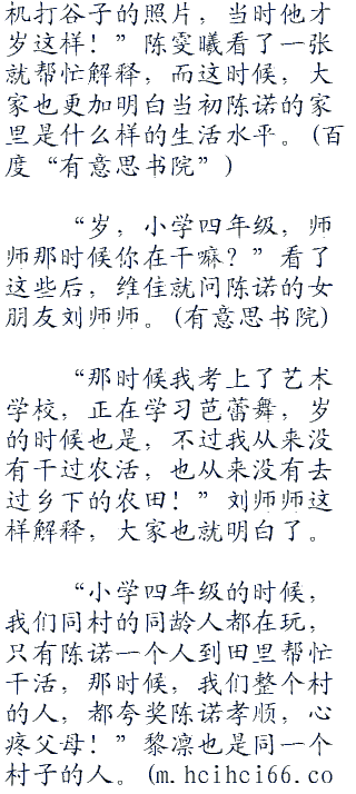 接着大家继续转身看,而当看到下一张是陈诺抓着一把水稻,站在人力打谷机前面,一边踩着一边打谷子的照片后,大家再次惊讶。
