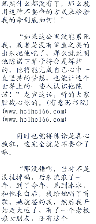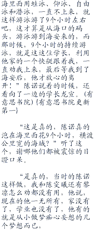 “这疯子,在那件事之后,他就说要离开三亚,离开海南,我说给他买船票,去内地闯闯吧,可他没有,愣是自己一个人就跳到海里面,说是要自己从海南的海口市的一个码头,就游泳横渡到g东的海安港!”陈雯曦说的这件事,震惊了刘师师他们。