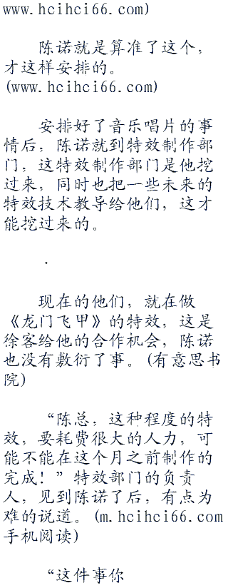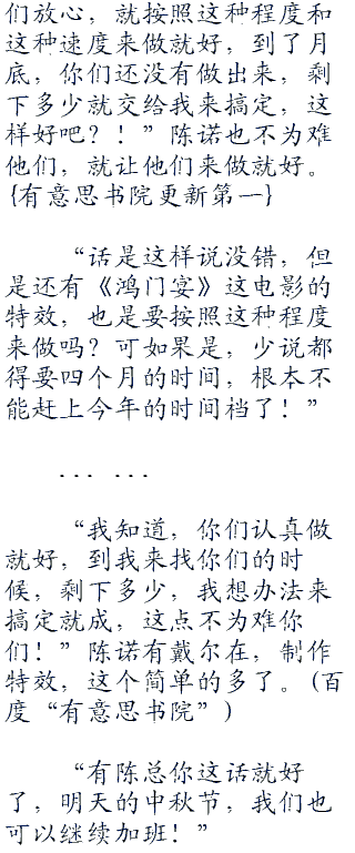 国际范,现在接了《鸿门宴》和《龙门飞甲》这两部电视剧的特效制作,还有《轩辕剑》这部电视剧的特效制作。