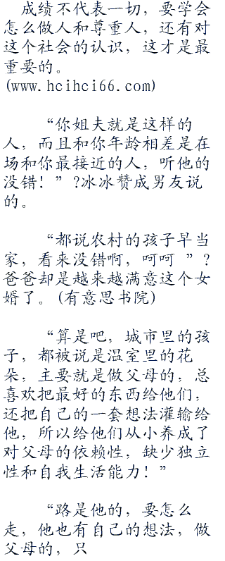 “去那边发展是好,但是叔叔阿姨肯定不会跟着去,到时候也是你姐姐和我来照顾,所以,你早点长大的话,你姐姐早几年生孩子,你爸爸妈妈还能帮忙带,带到他们带不动了,也就到姐夫和你姐姐照顾你父母了!”