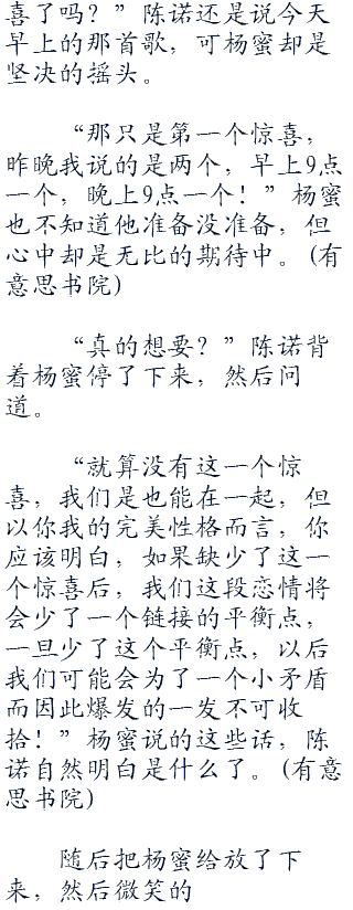 “那你想要,为什么都这么久了也不跟我表白?也没有给我准备惊喜?”杨蜜抱着陈诺的脖子,还侧头看着陈诺的侧脸。