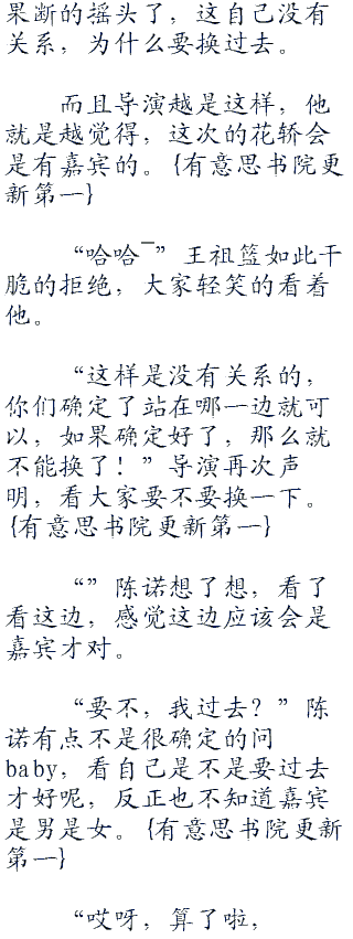 “这两个轿子里面,其中一个是有嘉宾,另外一个则是没有,而你们只要认为哪个轿子有嘉宾,就站在轿子的旁边就行了,如果真的有嘉宾,那么你们就会和他组成一个队伍!”导演解释了这次挑选嘉宾的规则后,大家也就都明白了。