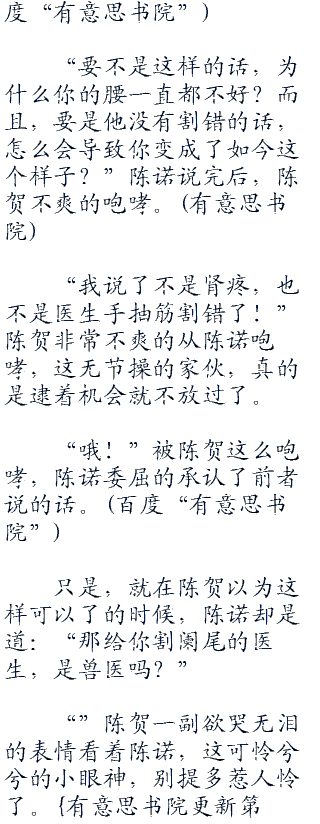 “我说了不是肾疼!”陈贺郁闷的冲陈诺大叫,再次声明自己不是肾疼。