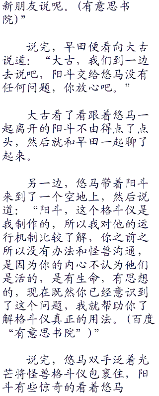阳斗沉默了一下,随后抬起头用炙热的眼神看着悠马说道:“悠马桑,我想请你教我如何跟格斗仪里的怪兽进行沟通,我想尝试着了解一下,怪兽们的想法。”