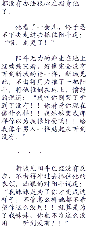 阳斗一脸阴沉坐在板凳上,双手撑在膝盖上上抱着脑袋,新城则在外面不停的走来走去,显示着心中的不平静。