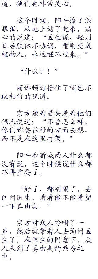 医生很理解他们的心情,也没有责怪他们情绪激动,很平静的说道:“真由美已经没有生命危险了。”