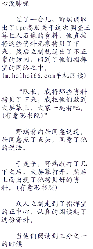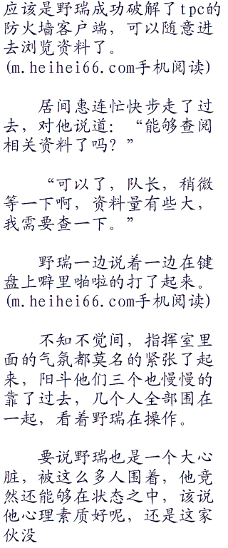 所以即便是野瑞这种电脑高手,想要黑进去查找自己这个等级无法查看的资料的话,就需要花费一定的时间,更何况还要不被人发现,不留任何痕迹,就更需要精益求精了。