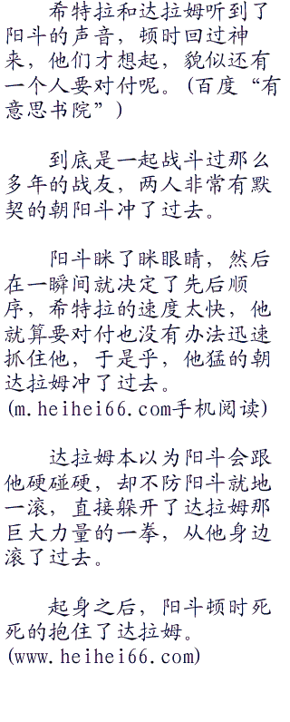希特拉和达拉姆是特点非常鲜明的两个黑暗战士,希特拉的特点是速度非常快,快到人眼完全看不清的地步,但是相对的,他的力量很弱,所以阳斗完全可以凭借ex哥莫拉的身体直接扛下来。