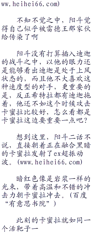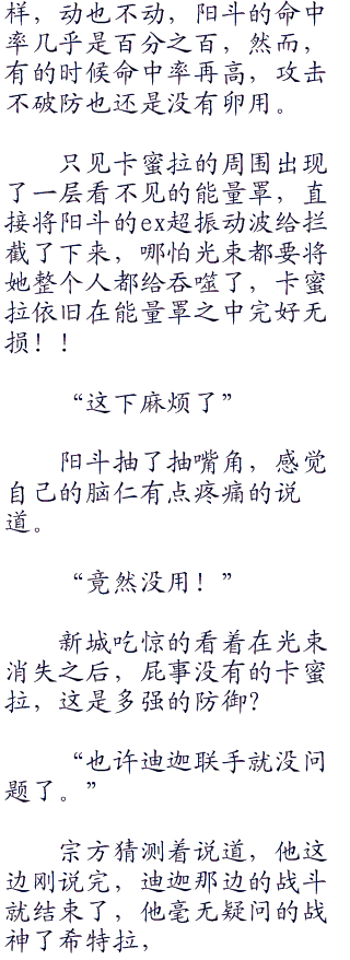 卡蜜拉在沐浴在黑暗之中,猖狂的笑着,发泄着在武力上不能战胜对方的郁闷,她终于在头脑上扳回了一成!