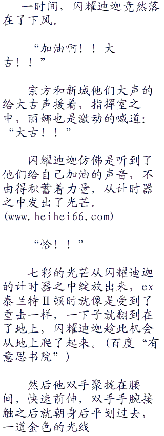 ex泰兰特2一刀挥了个空,顿时气得哇哇大叫,闪耀迪迦落地之后,立刻朝ex泰兰特2发出了一记闪耀迪迦切割,虽然没有将ex泰兰特2的身体给切开,但还是将ex泰兰特2打了一个趔趄,差点让他跌倒在了地上。