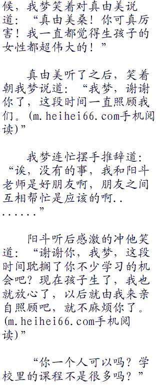 而真由美这边也因为阳斗也在当老师,所以拜“零八三”托我梦在他忙的时候帮忙照看一下,两个人交换着照顾真由美,所以当今天真由美要生孩子的时候,我梦会在第一时间来通知他。