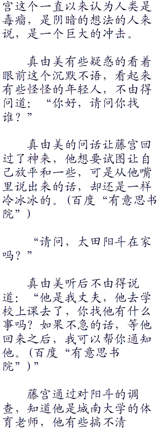 这一天,阳斗正好去学校上课去了,藤宫却来到了阳斗的家中。