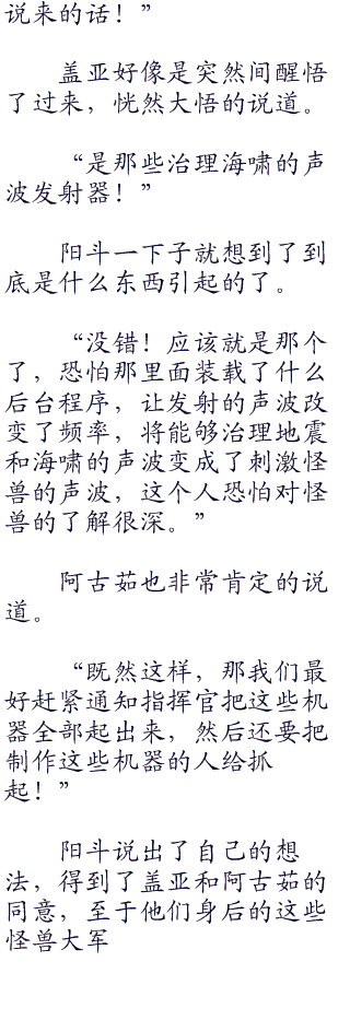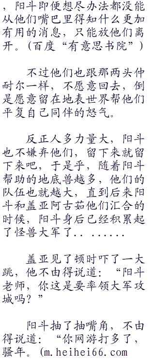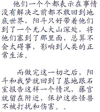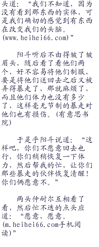 然而两头仲耐尔却没有按照阳斗所说的回去,他们犹豫了一下,其中一头仲耐尔对阳斗说道:“我们不敢回去,地底有奇怪的东西,就是那个让我们一下子发狂的。”