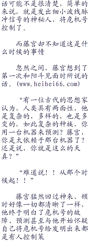 危机号上的一个小红灯在一闪一闪的,这是藤宫当时发明危机号的时候所特意留出的一个信号灯的位置,用来提示危机号运作正常,然而暴怒之后显得异常安静的藤宫忽然从这些滴滴声之中听到了不寻常的地方。