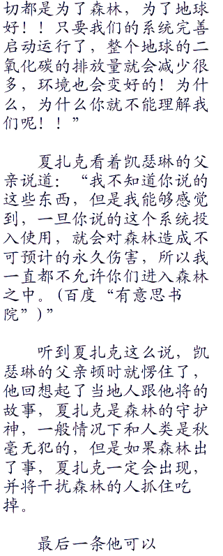 凯瑟琳的母亲叹了口气道:“传说都说夏扎克是森林的保护神,明明我们所做的事情对地球对森林都有好处,为什么夏扎克还会袭击我们呢?”