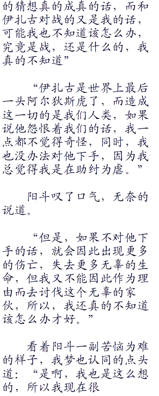 关于阿尔狄斯虎的描述,这本书上只有短短两页,上面记载阿尔狄斯虎曾经喝着被人类污染过含着重油的水源,也顽强的和人类猎人进行着战斗的故事。