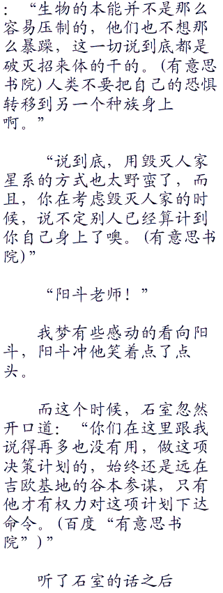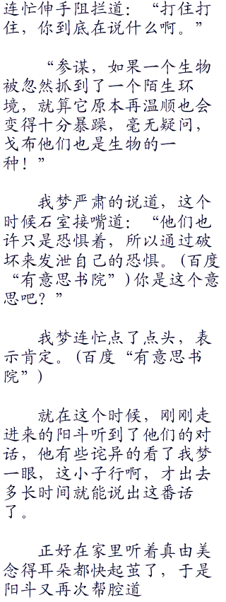 我梦一脸疑惑的看着她,提出了自己想法,谁知道她只是笑了笑道:“破灭招来体根本不需要用控制这种方式,其实它仅仅只是将他们从自己熟悉的地方抓来了不熟悉的地方,任何一种生物在来到了陌生环境之后都会变得比较暴躁和充满破坏力。”
